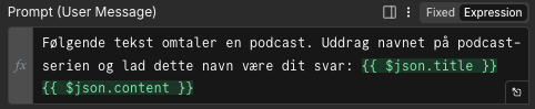 Vi uddrager titlen ($json.title) og brødteksten ($json.content) fra podcast-omtalen ind i en prompt: